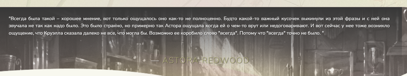 "Слишком мало времени прошло, чтобы она могла забыть, как это страшно и неприятно стать изгоями только потому, что родился с определенной фамилией и положением в обществе. Давление уже давно устаревших ярлыков ощущал каждый слизеринец, но почему-то никто из профессоров не спешил помогать, не старался разобраться или установить справедливость."